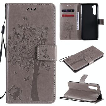 For OnePlus Nord Tree & Cat Pattern Pressed Printing Horizontal Flip PU Leather Case with Holder & Card Slots & Wallet & Lanyard(Grey)