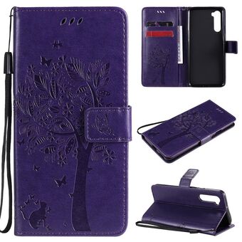 For OnePlus Nord Tree & Cat Pattern Pressed Printing Horizontal Flip PU Leather Case with Holder & Card Slots & Wallet & Lanyard(Purple)