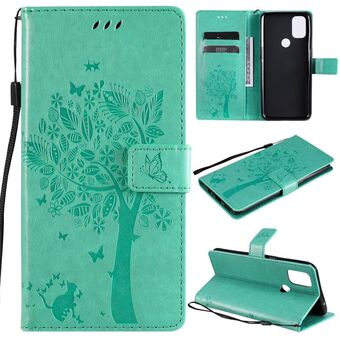 For OnePlus Nord N10 5G Tree & Cat Pattern Pressed Printing Horizontal Flip PU Leather Case with Holder & Card Slots & Wallet & Lanyard(Green)