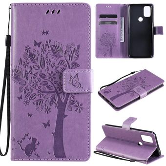 For OnePlus Nord N10 5G Tree & Cat Pattern Pressed Printing Horizontal Flip PU Leather Case with Holder & Card Slots & Wallet & Lanyard(Light Purple)