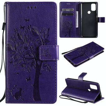 For OnePlus Nord N100 Tree & Cat Pattern Pressed Printing Horizontal Flip PU Leather Case with Holder & Card Slots & Wallet & Lanyard(Light Purple)