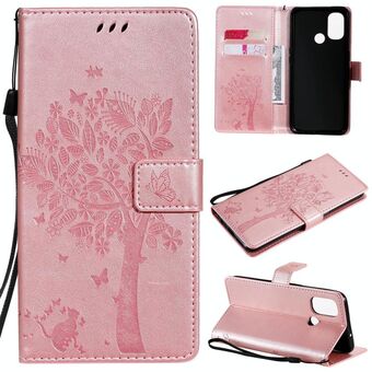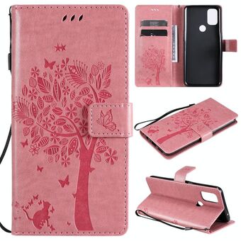 For OnePlus Nord N100 Tree & Cat Pattern Pressed Printing Horizontal Flip PU Leather Case with Holder & Card Slots & Wallet & Lanyard(Rose Gold)
