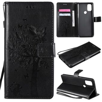 For OnePlus Nord N10 5G Tree & Cat Pattern Pressed Printing Horizontal Flip PU Leather Case with Holder & Card Slots & Wallet & Lanyard(Black)