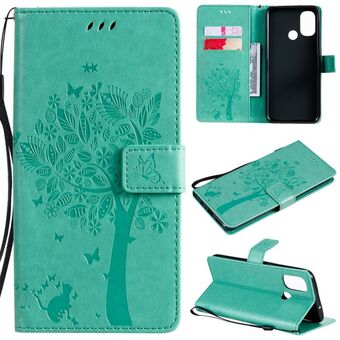 For OnePlus Nord N100 Tree & Cat Pattern Pressed Printing Horizontal Flip PU Leather Case with Holder & Card Slots & Wallet & Lanyard(Green)