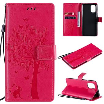 For OnePlus 8T Tree & Cat Pattern Pressed Printing Horizontal Flip PU Leather Case with Holder & Card Slots & Wallet & Lanyard(Rose Red)