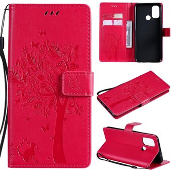 For OnePlus Nord N100 Tree & Cat Pattern Pressed Printing Horizontal Flip PU Leather Case with Holder & Card Slots & Wallet & Lanyard(Red)
