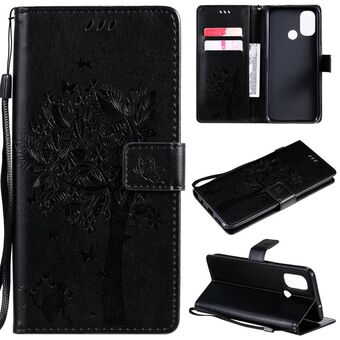 For OnePlus Nord N100 Tree & Cat Pattern Pressed Printing Horizontal Flip PU Leather Case with Holder & Card Slots & Wallet & Lanyard(Black)