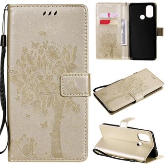 For OnePlus Nord N100 Tree & Cat Pattern Pressed Printing Horizontal Flip PU Leather Case with Holder & Card Slots & Wallet & Lanyard(Gold)