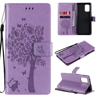 For OnePlus 8T Tree & Cat Pattern Pressed Printing Horizontal Flip PU Leather Case with Holder & Card Slots & Wallet & Lanyard(Light Purple)