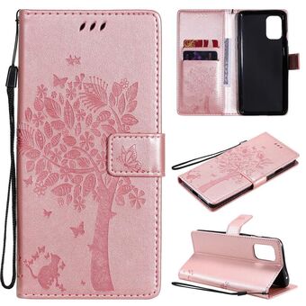 For OnePlus 8T Tree & Cat Pattern Pressed Printing Horizontal Flip PU Leather Case with Holder & Card Slots & Wallet & Lanyard(Rose Gold)