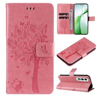 Για OnePlus Nord CE4 Tree & Cat ανάγλυφο μοτίβο Flip υπόθεση τηλεφώνου δέρμα (ροζ)