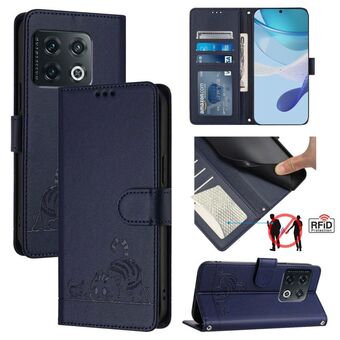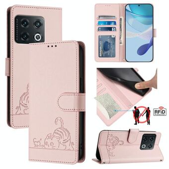 Θήκη τηλεφώνου από δέρμα με ανάγλυφο σχέδιο γάτας και ποντικού για OnePlus 10 Pro 5G, με λουρί (Μέντας Πράσινο)