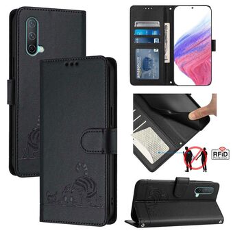 Θήκη τηλεφώνου από δέρμα με ανάγλυφο σχέδιο γάτας και ποντικιού για OnePlus Nord CE 5G, με προστασία RFID και λουρί (Μέντας Πράσινο)
