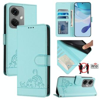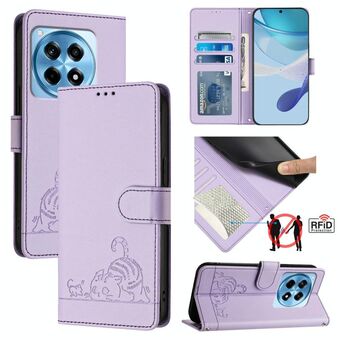 Θήκη τηλεφώνου από δέρμα με ανάγλυφο σχέδιο γάτας και RFID για OnePlus 12R 5G Global, με κορδόνι (Μέντας Πράσινο)