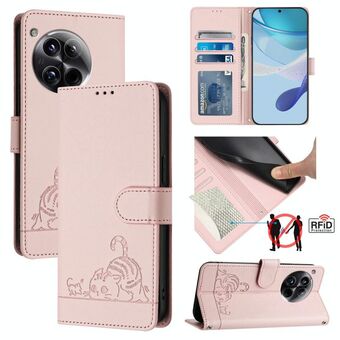 Θήκη τηλεφώνου από δέρμα με ανάγλυφο σχέδιο γάτας και RFID για OnePlus 12 5G Global, με κορδόνι (Μέντας Πράσινο)