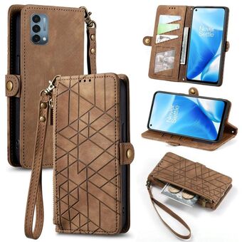 Για OnePlus Nord N200 5G γεωμετρική φερμουάρ πορτοφόλι πλευρά πόρπη δερμάτινη θήκη τηλεφώνου (καφέ)