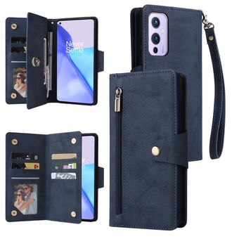 Για OnePlus 9 Rivet πόρπη 9 κάρτες τρεις φορές δερμάτινη θήκη τηλεφώνου (μπλε)