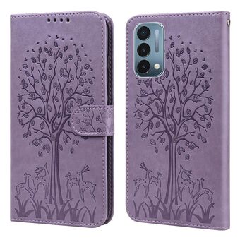 Για OnePlus Nord CE 5G δέντρο & ελάφια μοτίβο πιεστεί εκτύπωση οριζόντια Flip δέρμα τηλέφωνο υπόθεση (μωβ)