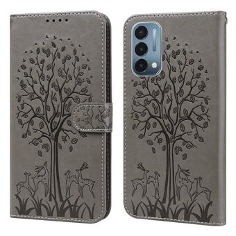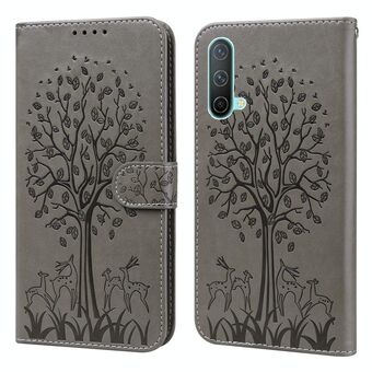 Για OnePlus Nord CE 5G δέντρο & ελάφια μοτίβο πιέζεται εκτύπωσης οριζόντια Flip δέρμα τηλέφωνο υπόθεση (γκρι)
