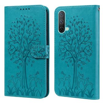 Για OnePlus Nord CE 5G δέντρο & ελάφια μοτίβο πιέζεται εκτύπωσης οριζόντια Flip δέρμα τηλέφωνο υπόθεση (μπλε)