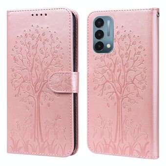 Για OnePlus Nord CE 5G δέντρο & ελάφια μοτίβο πιέζεται εκτύπωσης οριζόντια Flip δέρμα τηλέφωνο υπόθεση (ροζ)