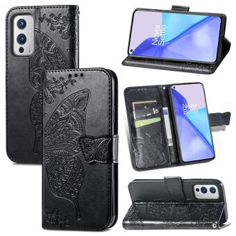 Για OnePlus 9 πεταλούδα αγάπη λουλούδια ανάγλυφο οριζόντια Flip δερμάτινη θήκη με κάτοχο & υποδοχές για κάρτες & πορτοφόλι & κορδόνι (μαύρο)
