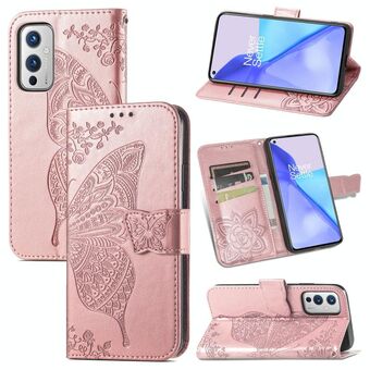 Για OnePlus 9 πεταλούδα αγάπη λουλούδια ανάγλυφο οριζόντια Flip δερμάτινη θήκη με κάτοχο & υποδοχές για κάρτες & πορτοφόλι & κορδόνι (Rose Gold)