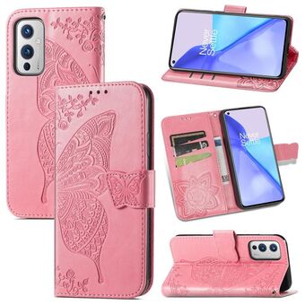 Για OnePlus 9 πεταλούδα αγάπη λουλούδια ανάγλυφο οριζόντια Flip δερμάτινη θήκη με κάτοχο & υποδοχές για κάρτες & πορτοφόλι & κορδόνι (ροζ)