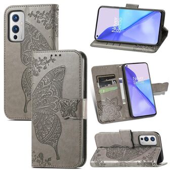 Για OnePlus 9 πεταλούδα αγάπη λουλούδια ανάγλυφο οριζόντια Flip δερμάτινη θήκη με κάτοχο & υποδοχές για κάρτες & πορτοφόλι & κορδόνι (γκρι)