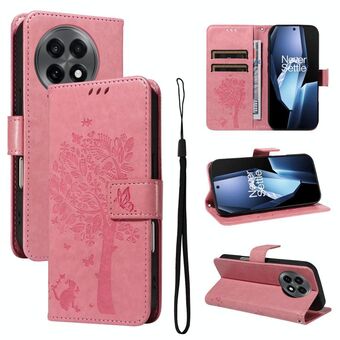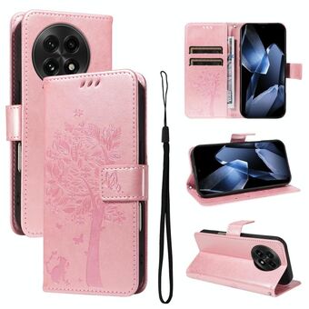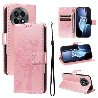 For OnePlus 13 Tree & Cat Embossed Pattern Flip Leather Phone Case(Rose Gold)