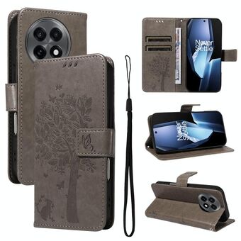 For OnePlus 13R Global Tree & Cat Embossed Pattern Flip Leather Phone Case(Grey)