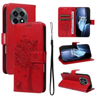 For OnePlus 13R Global Tree & Cat Embossed Pattern Flip Leather Phone Case(Red)