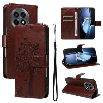 For OnePlus 13R Global Tree & Cat Embossed Pattern Flip Leather Phone Case(Coffee)
