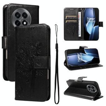 For OnePlus 13R Global Tree & Cat Embossed Pattern Flip Leather Phone Case(Black)