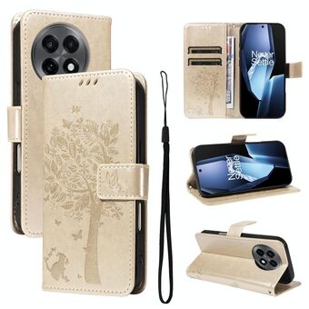 For OnePlus 13R Global Tree & Cat Embossed Pattern Flip Leather Phone Case(Gold)