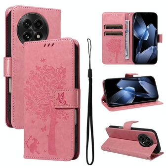 For OnePlus 13 Tree & Cat Embossed Pattern Flip Leather Phone Case(Pink)