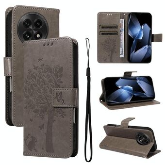 For OnePlus 13 Tree & Cat Embossed Pattern Flip Leather Phone Case(Grey)