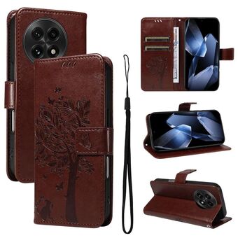 For OnePlus 13 Tree & Cat Embossed Pattern Flip Leather Phone Case(Coffee)