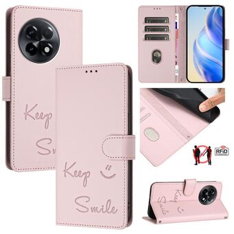 Για OnePlus 11R 5G Παγκόσμια χαμόγελο ανάγλυφο RFID δερμάτινη θήκη τηλεφώνου (ροζ)