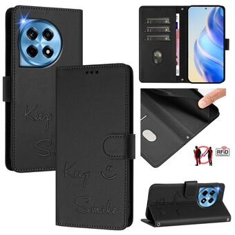 Για OnePlus 12R 5G Παγκόσμια χαμόγελο ανάγλυφο RFID δερμάτινη θήκη τηλεφώνου (Μαύρο)