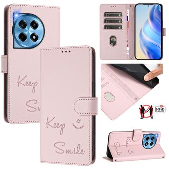 Για OnePlus 12R 5G Παγκόσμια χαμόγελο ανάγλυφο RFID δερμάτινη θήκη τηλεφώνου (ροζ)