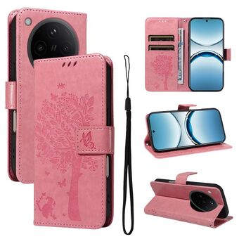 For OPPO Find X8 Global Tree & Cat Embossed Pattern Flip Leather Phone Case(Pink)