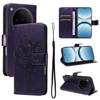For OPPO Find X8 Global Tree & Cat Embossed Pattern Flip Leather Phone Case(Purple)