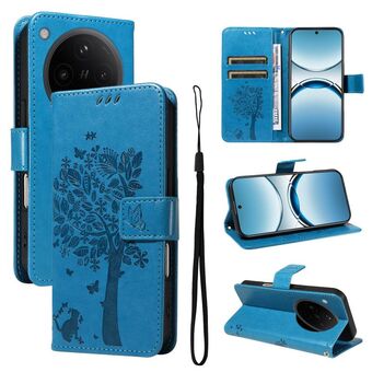 For OPPO Find X8 Global Tree & Cat Embossed Pattern Flip Leather Phone Case(Blue)