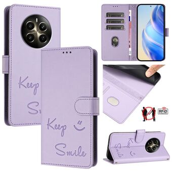 Για Realme 12 + 5G Παγκόσμια χαμόγελο ανάγλυφο RFID δερμάτινη θήκη τηλεφώνου (Light Purple)
