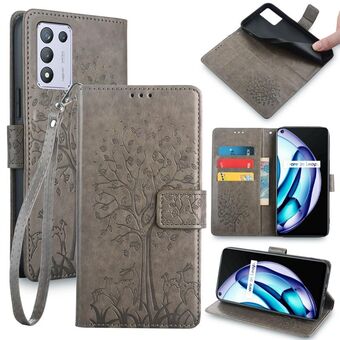 Για Realme Q3S δέντρο & ελάφι ανάγλυφη δερμάτινη θήκη τηλεφώνου (γκρι)