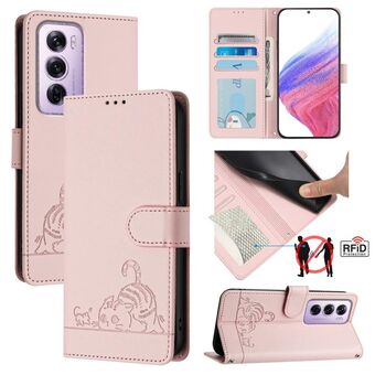 For OPPO Reno12 Pro Global Cat Rat Embossed Pattern RFID Leather Phone Case with Lanyard(Pink)