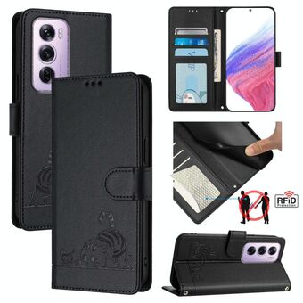 For OPPO Reno12 Pro Global Cat Rat Embossed Pattern RFID Leather Phone Case with Lanyard(Black)