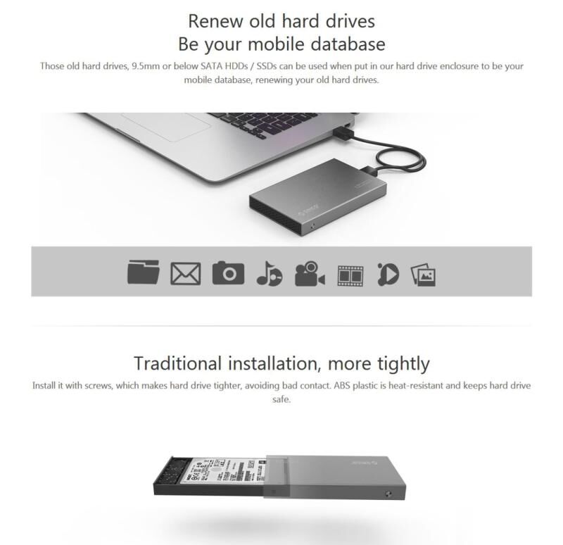 6. Αναζωογονήστε παλιούς σκληρούς δίσκους, γίνετε η φορητή σας βάση δεδομένων: Αυτοί οι παλιοί σκληροί δίσκοι, σκληροί δίσκοι / SSD SATA 9,5 mm ή μικρότεροι μπορούν να χρησιμοποιηθούν όταν τοποθετηθούν στο κουτί σκληρού δίσκου μας για να γίνουν η φορητή σας βάση δεδομένων, αναζωογονώντας τους παλιούς σας σκληρούς δίσκους.