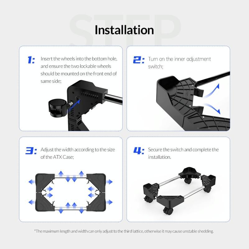 3. Αυτή η βάση πύργου υπολογιστή διαθέτει τέσσερις τροχούς (2 μπλοκαριστούς τροχούς), σχεδιασμένους για να βελτιώσουν την κινητικότητα και τη σταθερότητα, ώστε να μπορείτε να μετακινήσετε εύκολα τον υπολογιστή. Εισάγετε τους τροχούς στην κάτω οπή και βεβαιωθείτε ότι οι δύο μπλοκαρισμένοι τροχοί πρέπει να τοποθετηθούν στο μπροστινό άκρο της ίδιας πλευράς.